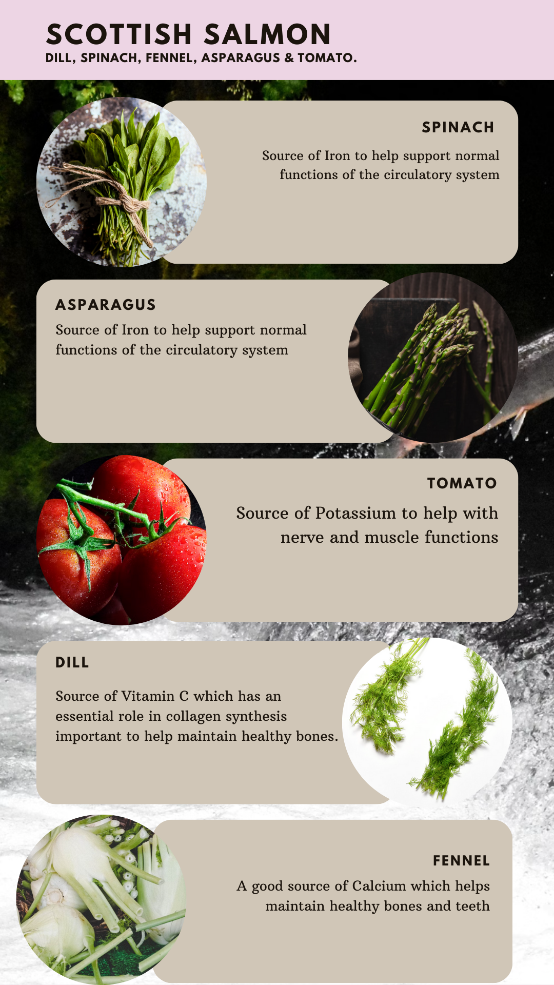 Scottish Salmon With Dill, Spinach, Fennel, Asparagus & Tomato.